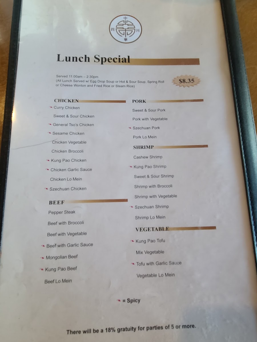 Nestled in Frisco, Colorado, China Szechuan enchants diners with its vibrant blend of authentic Szechuan flavors and warm hospitality. This family-owned gem offers a delectable variety of dishes that cater to all palates. The menu boasts mouthwatering appetizers like the Pu Pu Platter and an enticing selection of lunch specials for just $11.35, featuring options such as Kung Pao Tofu and Szechuan Pork.